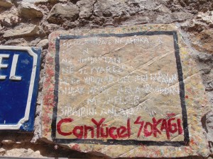 Eski Datça’da Can Yücel’in izini sürüyoruz. İlk uğrak yerimiz meydandaki Orhan’ın Yeri. Orhan Bey, Can Yücel’i Datçalı yapan adammış, duvardaki yazılardan öğreniyorum bunu. Masası, yarım kalmış şarabıyla Can Yücel’in anılarına sahip çıkmış. Can Yücel’in, ölmeden önce bir de vasiyeti var arkadaşı Orhan’a. Şöyleymiş vasiyet: 1. Ardımdan kimse ağlamasın. 2. Mezarım denize karşı olsun. 3. Tabutumu kadınlar taşısın. Can Yücel öldükten sonra yaptığı konuşmada ilk iki vasiyetini söylemiş ama üçüncüsünü söylemeye çekinmiş Orhan Bey.