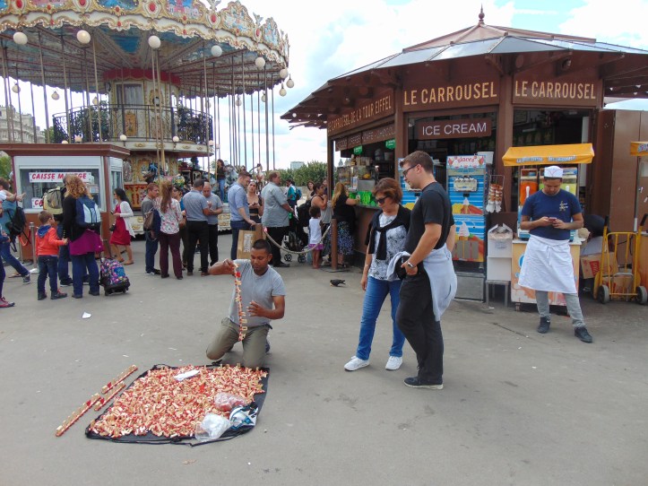 Eyfel’in olduğu meydanın Sultanahmet Meydanı’ndan kalır yanı yok. Adım başı Türk’e rastlamak mümkün, o kadar ki hediyelik eşya satan zenciler Türkçe biliyor. Hediyelik eyfellerden alırken pazarlığı Türkçe yaptım. Yalnız, burada ne alırsanız yarısını söyleyin derim. Belki daha da düşerler ama ben biraz da onlar kazansın dedim.