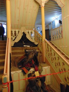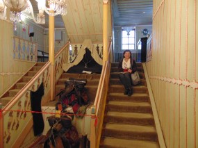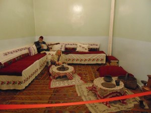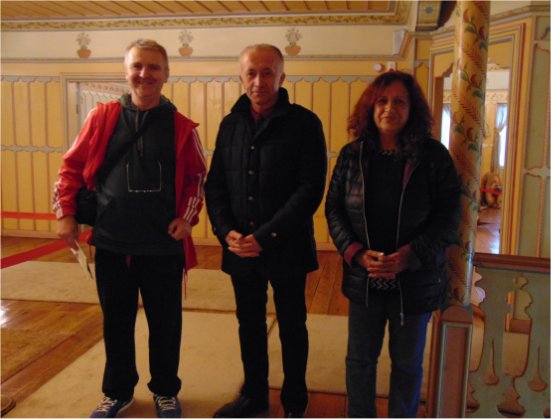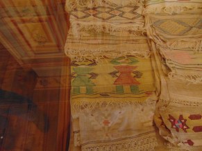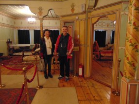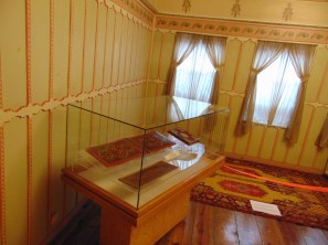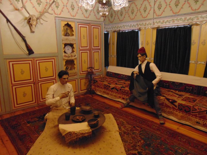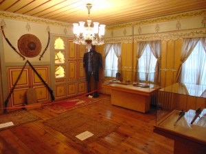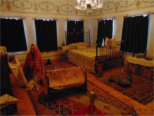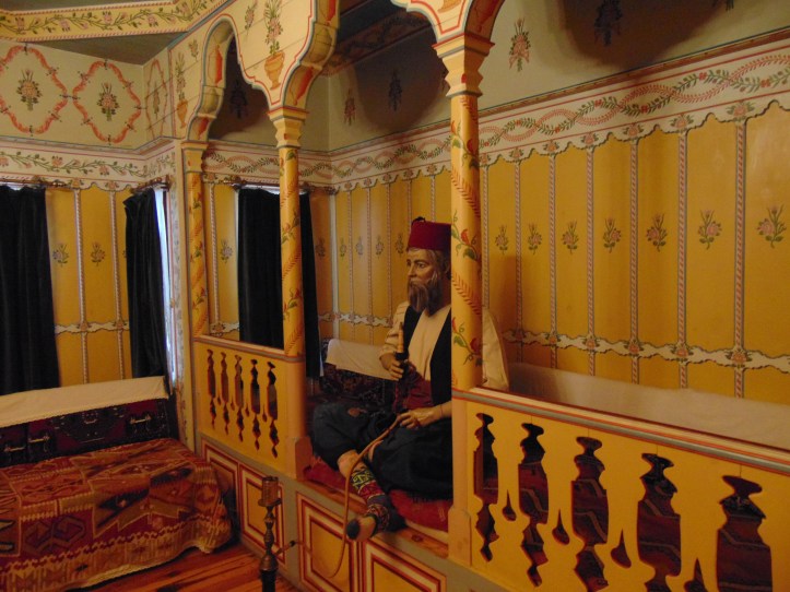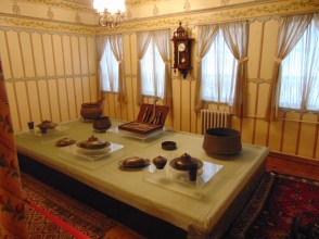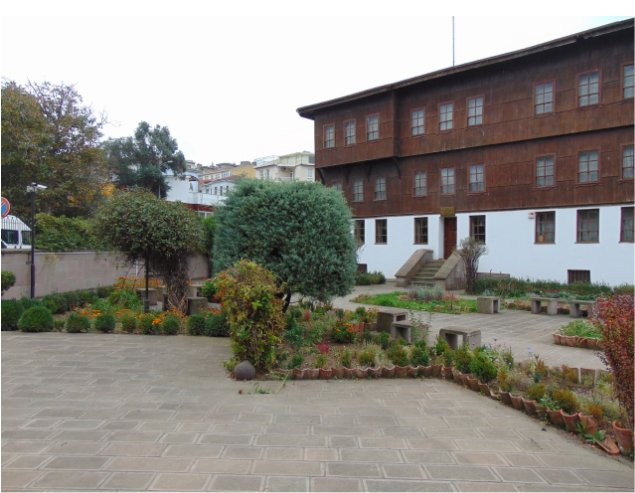 Etnografya Müzesi, zemin katıyla birlikte dört kattan oluşan ahşap bir konak. Çok etkileyici bir mimarisi var. İki girişi bulunuyor. Sokağa açılan ana girişi kullanılmıyor. Çiçeklerle dolu bahçesinden girdiğimizde içimizi ısıtan gülüşüyle müze görevlisi Nebahat Hanım’la karşılaştık. Bahçedeki kameriyede oturuyordu. Sonra birlikte içeriye girdik. Diğer müze görevlisi Yalçın Bey ile birlikte müzeyi gezimiz sırasında bize eşlik ettiler ve bilgi verdiler. İkisi de son derece kibar ve ilgiliydi.