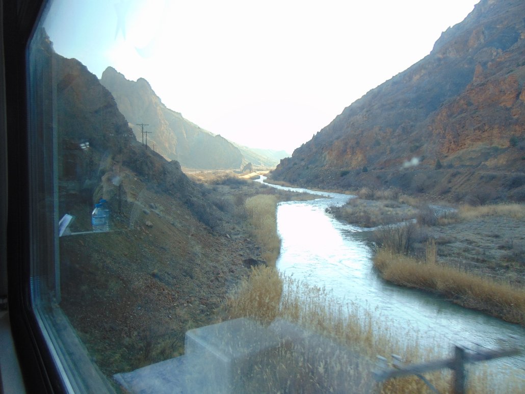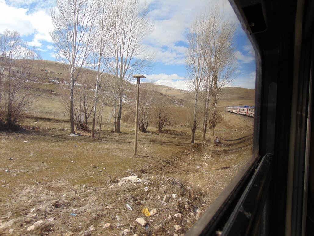 6.30 Çetinkaya İstasyonu. Hava ağardı. Dolunay bıraktı bizimle yolculuğu. Yoldaşımız sis artık. Manzara yine doyumsuz. Sonra Divriği… Trenimiz sık sık kayalıklara açılmış tünellerden geçiyor. Köprülerden, nehirlerin yanı başından… Yolculuğun bu bölümlerinde telefon çekmiyor. En güzel manzara Erzincan yakınlarında başlıyor. İliç’te Bağıştaş Baraj Gölü ile 8.30 civarında karşılaşıyoruz. Yanımızda kar sularıyla coşmuş Fırat, yaramaz bir çocuk gibi bir sağımıza bir solumuza geçerek akıyor. Saat 10 sularında Kemah’tayız. Karşımızda karla kaplı Munzur Dağları… Ve nihayet, Ahmet Muhip Dıranas’ın ünlü Fahriye Abla şiirinde sözünü ettiği “dağları karlı Erzincan”dayız. Trenimiz beş on dakika kadar duruyor. Yolcular inip istasyonda fotoğraflar çekiyor. Erzincan’dan sonra kondüktör, bütün kompartımanları dolaşarak cağ kebabı siparişi alıyor.