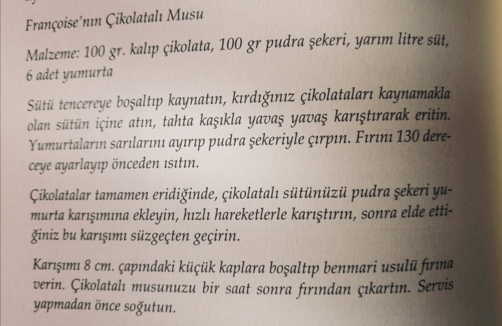 Proust’un kitaplarında anlattığı bu yemekler, bir yayınevi tarafından kitapta toplanarak “Yeniden Keşfedilmiş Mutfak” adıyla 1991’de yayımlanmış. Anlatıcı’nın halasının Combray’deki evinde hizmetçi Françoise’nın aile için hazırladığı çikolatalı mus da bu tariflerden biri… Aşağıdaki tarif, Proust’un bu tatlısını denemek isteyenler için…