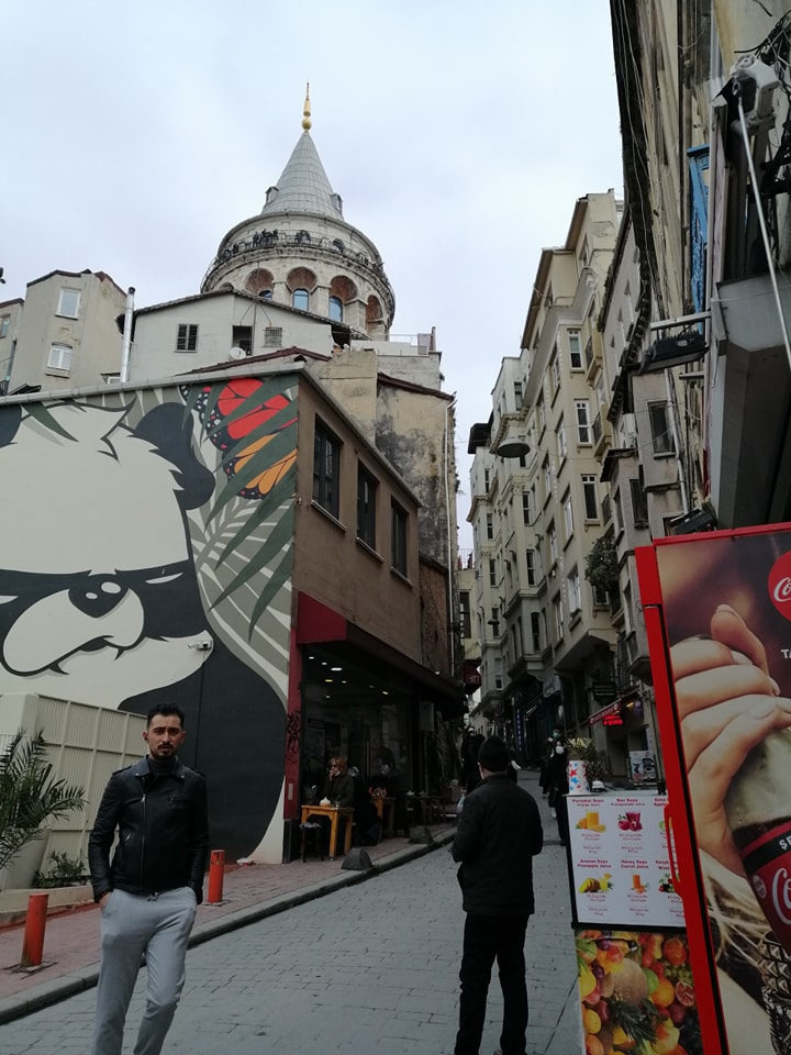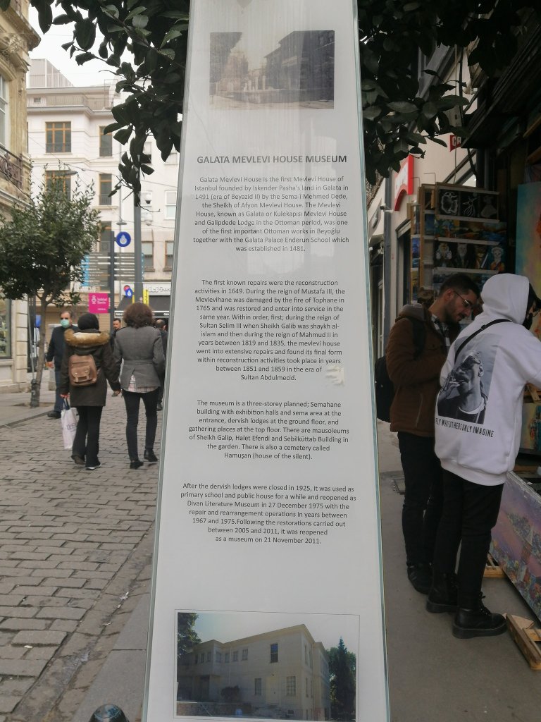 Yavuklusu Kız Kulesi’ni beton binaların arasından, görmeye çalışan kültürlü damat adayı Galata Kulesi’ni şiiri ve şehri beklemeye devam etsin diye arkamızda bırakarak Tünel’e doğru yokuşu tırmanmaya devam ediyoruz. Bu yokuşun adı Galip Dede Caddesi… Galip Dede Caddesi, bizi müzik aletleri satan dükkânların arasında kaybolmuş gibi duran Galata Mevlevihanesi’nin önüne getirip bırakıyor. Sanki yorgunluğumuzu anlayarak biraz burada soluklanın, der gibi…