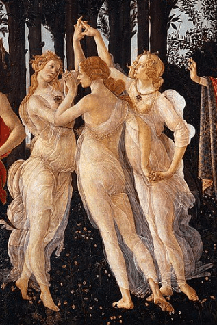 “Üç Güzeller” İtalya’daki üç liman şehrini sembolize ediyor.Sola doğru eğilmiş ortadaki figür, Pisa’yı temsil etmekte. Çünkü bu figürün başının üstünde iki kadının birleşen ellerinin arasında oluşan boşluk, Pisa Kulesi’ni andırıyor. Cupid de okunu Pisa’yı temsil eden ortadaki Kharit’e yöneltmiş. Soldaki Kharit, Medici ailesinin bireylerinden Guiliano de Medici’nin eşi Simonetta’nın portresidir. Simonetta, Cenovalı’dır ve “Cenova’nın incisi” olarak anıldığından, Cenova şehrini; üçüncü Kharit ise Napoli şehrini simgelemektedir.