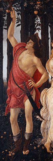 Tablonun solunda yer alan kırmızı kıyafetli figür, haberci tanrı Merkür’dür. Merkür, hekimlerin simgesi kanatlı yılanın sarıldığı asası Caduceus ile bahçenin baharına gölge düşmesini önlemek için bulutları dağıtmaktadır. Botticelli’nin beş yüz civarında çiçek ve bitkiyi resmettiği İlkbahar Alegorisi, bu hâliyle bir botanik bahçesini andırıyor. Portakal, Medici ailesinin sembolüdür.
