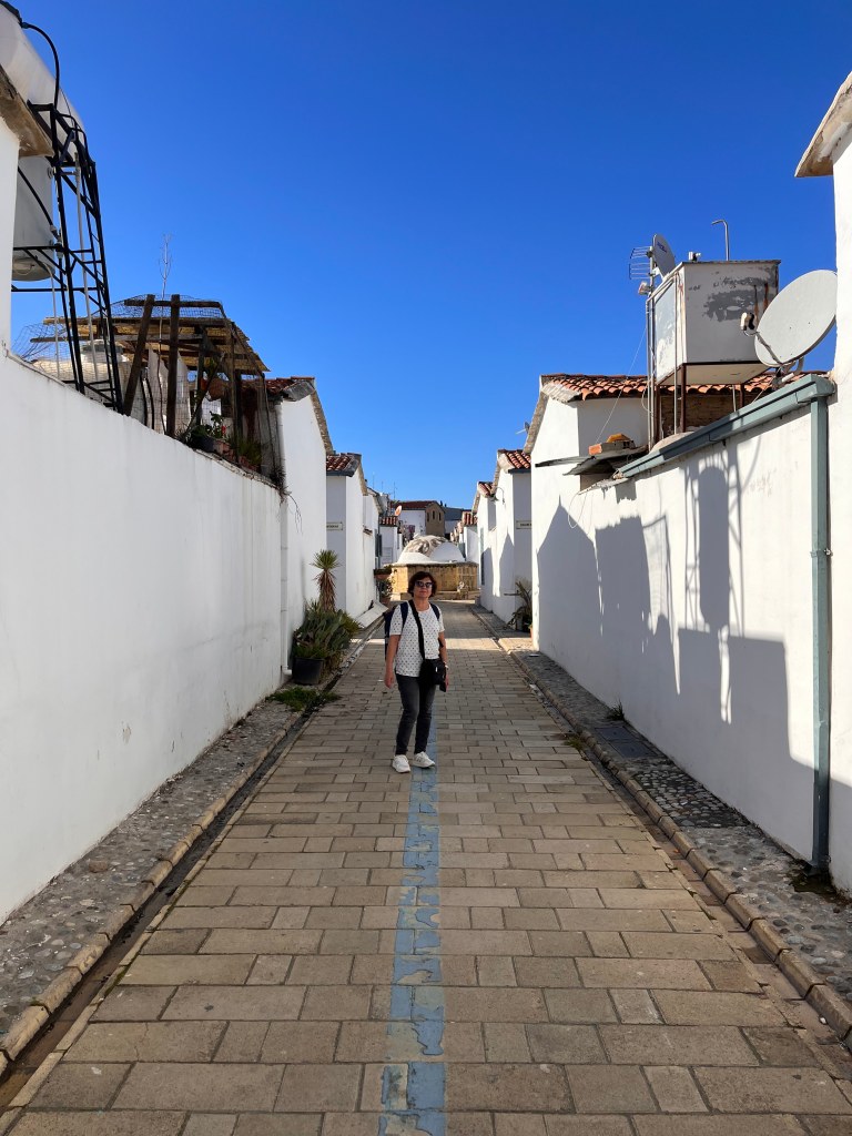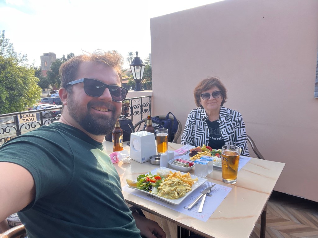 Mağusa gezi listeme aldığım yerlerin Salamis Harabeleri ve Kapalı Maraş dışında hemen hepsi Tarihi Mağusa şehrinin içindeydi ve buraları yürüyerek öğle saatlerine kadar gezdik. Dinlenmek ve acıkan karnımızı doyurmak için tercih ettiğimiz Petek Pastanesi de çok yakındı. Pastane, Lala Mustafa Paşa Camii’ne bir iki dakikalık yürüme mesafesinde. Pastane dediğime bakmayın aynı zamanda restoran hizmeti de veriyorlar. Dediklerine göre tatlıları da “efsane” imiş ama biz Kıbrıs’ın meşhur hellimli köftesini denemek istedik. Tabii yanında pilav, salata ve buz gibi bira da olunca, terasta aralık güneşinin altında çok keyifli bir iki saat oturduk. Yemekler çok güzel ama biraz pahalıydı. Olsun, Kıbrıs’a da her gün gelmiyoruz ya…