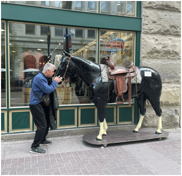 Bir sokak köşesinde Van Gogh ile de karşılaştık. Biraz daha ilerleyince kovboy malzemeleri satan bir bir dükkanın önünde karşılaştığımız atın da gönlünü almayı ihmal etmedik. Calgary’nin bulunduğu bölgede, aynı zamanda büyükbaş hayvancılık merkezi olduğu için şehirde rodeo teması ağır basıyormuş ve her temmuz ayında bir rodeo festivali düzenleniyormuş. On günlük bu etkinlikte geçit törenleri, sahne şovları ve dünyanın en büyük rodeolarından biri gerçekleşiyormuş. Buraya cowgary de demek mümkün…