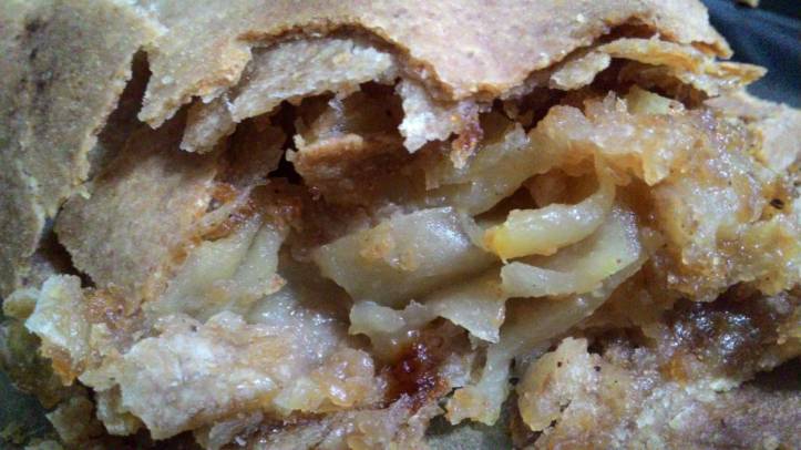 - 1 su bardağı kadar ekmek unu (145 gr) Benim kullandığım un, su değirmeninde çekilmiş karakılçık buğday unu. Tam buğday unu veya atalık un da deniyor. Yalnız bu undan hazırlanmış hamurun incecik açılması biraz zor. Bir sonrakinde yarı yarıya beyaz unla deneyeceğim. Yine de şunu belirtmeden geçemeyeceğim, tam buğdayı ile yaptığım strudel çok lezzetli oldu, üstü çıtır çıtır, içi yumuşacık…