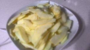 - Elmaları soyun, çekirdeklerini çıkarın ve dörde bölün. Her dilimi incecik doğrayın ve limon suyu ile karıştırarak kararmasını önleyin. (Elmaları hamuru açmadan hemen önce doğrayın.)
