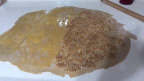 - Temiz ve hafifçe unlanmış bir yüzey üzerinde oklava ile hamuru mümkün olduğu kadar, dikdörtgen şekil vererek açın.