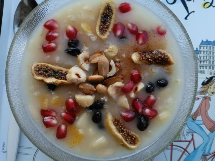 Bir şey daha: İngilizcede de Noah’s Pudding (Nuh’un Pudingi) olarak geçiyor. Bu kez hakkımızı yememişler, Türk tatlısı demişler.