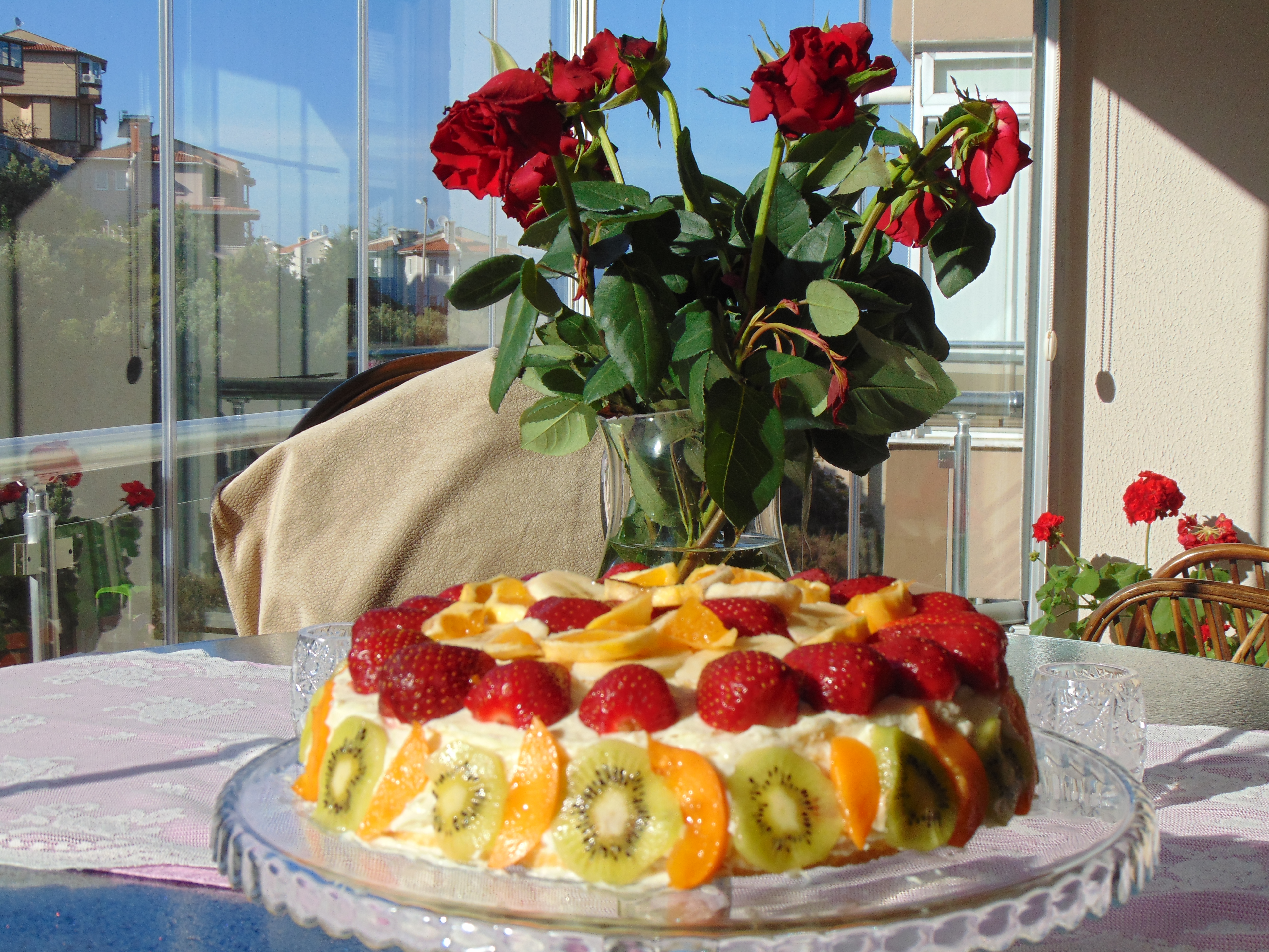 Sevdiğimiz meyvelerle pastanın üzerini süsleyelim.